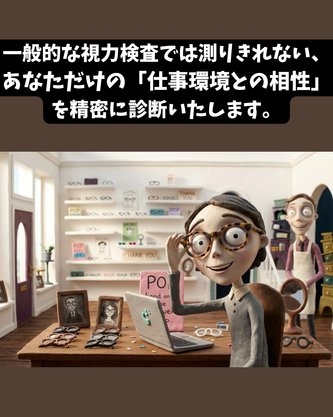 従来の視力検査は「遠くがどこまで見えるか」を競うようなものでした。 しかし、お仕事メガネで大切なのは、「どれだけ長時間、楽に集中し続けられるか」です。